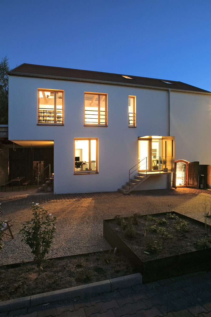 Die hinter dem Haus im Erdgeschoss gelegene ehemalige Werkstatt wurde zu einer Loggia umgedeutet, die sich mit dem kompakten hofartigen Außenraum verbindet. Im Hof wurden alle Einbauten wie Pflanzkanten, Regenwasserelement und Brennholzlager aus Stahlblech eingebaut. Aus der Verwandschaft der Materialien des Hofs und der Zugangssituation an der Nordfassade entsteht ein enges Zusammenspiel von Gebäude und Außenraum.