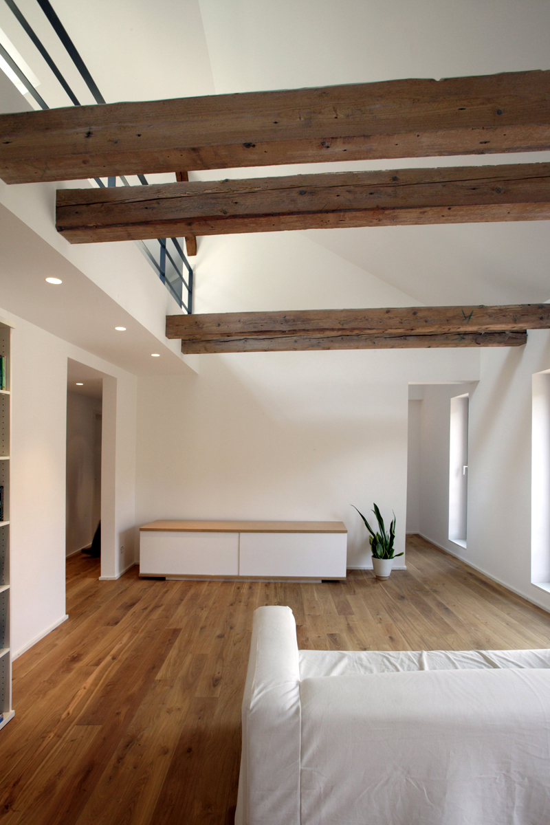 An wenigen, bewusst gewählten Stellen wurde die vormalige Bausubstanz in Form von Deckenbalken und Natursteinwänden sichtbar gemacht, ohne diese zu dramatisieren.
