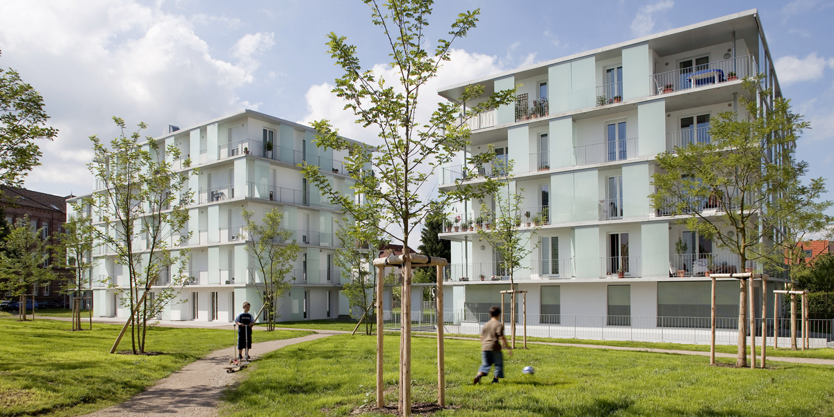 Das städtebauliche Konzept, resultierend aus einem Wettbewerb vom Juli 2006, sah nach Abbruch der Wohngebäude und Garagenzeilen unter dem Leitgedanken "Wohnen in allen Lebensphasen" drei fünfgeschossige Punkthäuser im Süden und Doppelhäuser im Norden vor. Wettbewerbsgewinner waren die Architekten Baumschlager-Eberle aus St. Gallen. Außergewöhnliches Entwurfsmerkmal ist der neu geschaffene, öffentliche Park mit integrierter Multifunktionsfläche, dem Kernstück des Areals. Große Einzelbäume, Ruhezonen und ein Spielangebot für Kinder und Jugendliche bieten die Möglichkeit für ein lebendiges Miteinander. Die Multifunktionsfläche für Fußball-, Handball- oder Basketballspiele sowie ein Grünes Klassenzimmer ermöglicht der Schule, den Bewohnern und auch der Öffentlichkeit unterschiedlichste Aktivitäten. Das Landschaftsplanungsbüro Vogt aus Zürich erstellte hierzu die Planung.