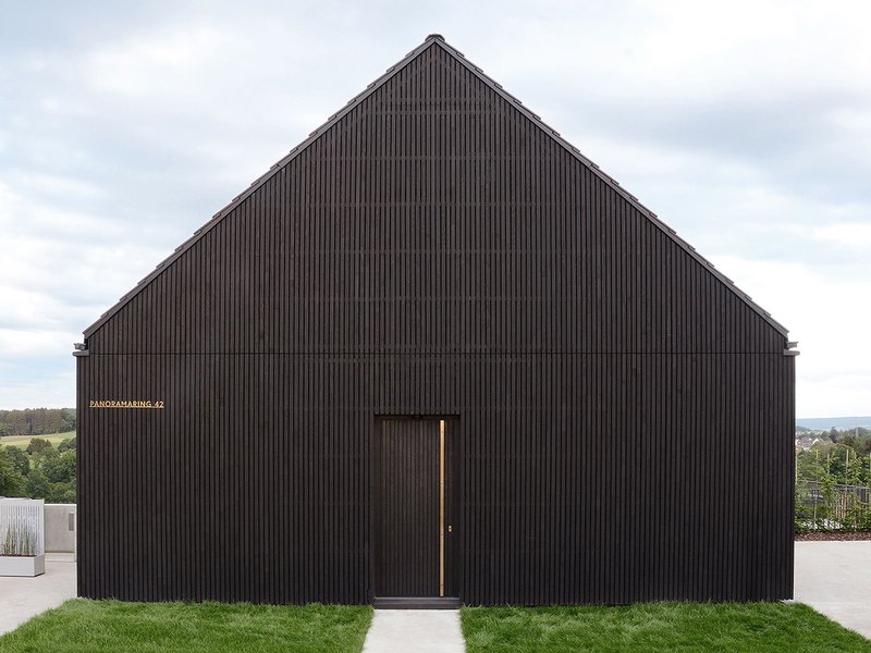 Ansatz – Haus der KontrasteGrundlegend bei der Gestaltung des Hauses war und ist der Reiz der Gegensätze. So präsentiert sich das massive Holzhaus zur Straßenseite geschlossen mit einer schwarz geölten Fassade aus vertikal verlaufendem Tannenholz. Nur ein Schriftzug sowie Griffstange und Türschloss aus Messing setzen Akzente. Talabwärts öffnet sich das Gebäude in Richtung Süden und die grandiose Glasfront gibt den Blick frei auf die Natur.
