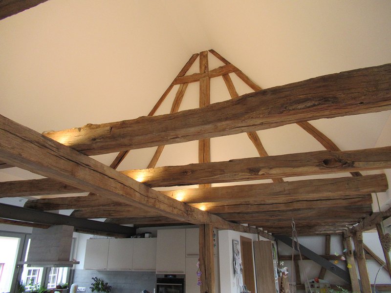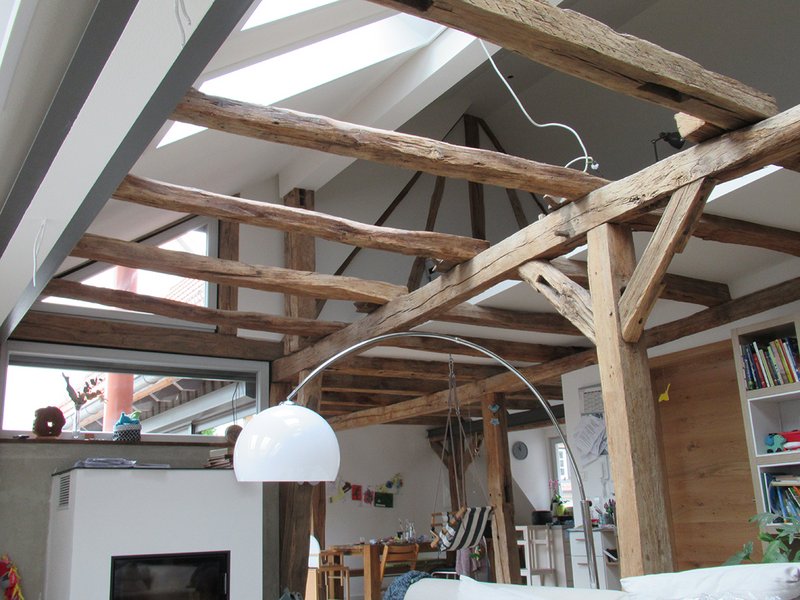Die Aufgabe war es, aus drei Scheunen ein Wohnhaus zu schaffen und dabei das Gesamtbild im Stadtbereich zu wahren. Die Materialien wurden im Originalzustand belassen. Durch die vorgegebene Balkenlage der drei Scheunen wurden die Geschossebenen vorgegeben. Zur optimalen Belichtung der Wohnräume wurde das Dach mit Dachgauben ausgebaut.