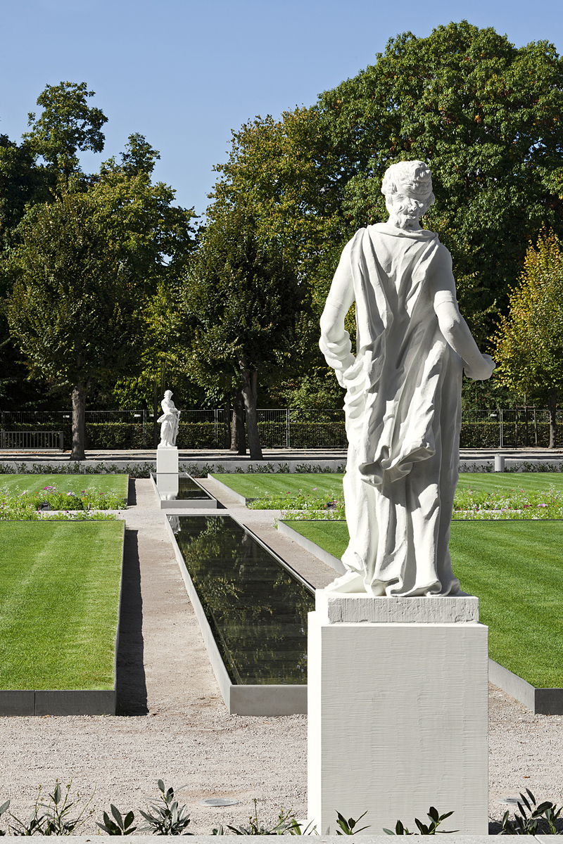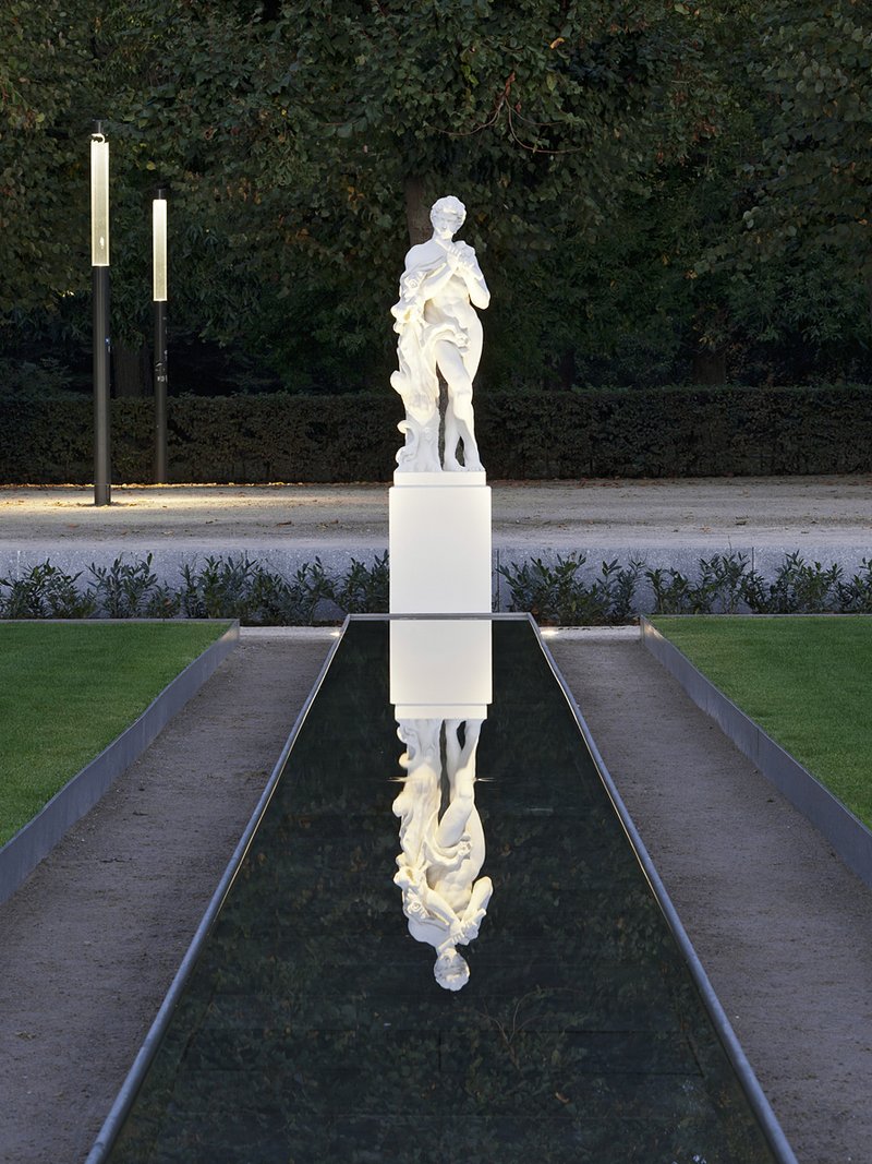 NeukonzeptionDie Hauptachse zwischen Stadt und Schlossportal - die Via Triumphalis - wird gestärkt. Dabei unterstützt die Ausrichtung des Mittelparterres die axiale Ausrichtung auf das Schloss, indem eine großzügige flächige Gestaltung mittels Rasenfelder die Via Triumphalis beidseitig fasst. Die flächige Gestaltung lässt die flankierenden Baumvolumen und die Schlossfassade in Sinne einer Ensemblewirkung dominieren. Die Lengelacher Skulpturen sind im Mittelparterre neu positioniert, rücken in Aughöhe der Schlossbesucher und gliedern das Mittelparterre. In den Achsen zweier sich gegenüberstehender Skulpturen entstehen Fugen, die die Fläche des Parterres rhythmisieren. Schmale Wasserbänder in den Fugen lenken den Blick und inszenieren die Figuren, die sich in einem dezenten Wasserfilm spiegeln. Die Höhe der Wasserbänder entspricht dem Niveau der angrenzenden Rasenflächen, wodurch das Mittelparterre in der Fernwirkung flächig und homogen erscheint. Entlang der Via Triumphalis erhält es wieder eine blühende Bepflanzung in einer zeitgemäßen Interpretation der historisch sehr farbig gestalteten Anlage und führen den Betrachter zum Ehrenhof. Die Pflanzung soll ganzjährig den Schlossplatz schmücken sowie den Wechsel der Jahreszeiten visualisieren.