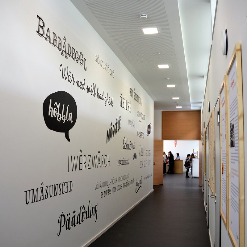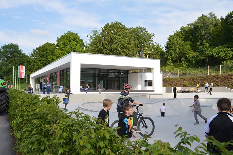 Die hellen lichten Räume sind multifunktional und auf vielfältigste Art zukünftig nutzbar und veränderbar. Im Gebäudeinneren entwarf das Designbüro Ihro eine Landschaftskarte und eine Dialektwand, die gestalten und unterhalten. Der Einzug der Jugendlichen wird das Gebäude im Inneren zu einem hellen bunten Jugendhaus verwandeln.