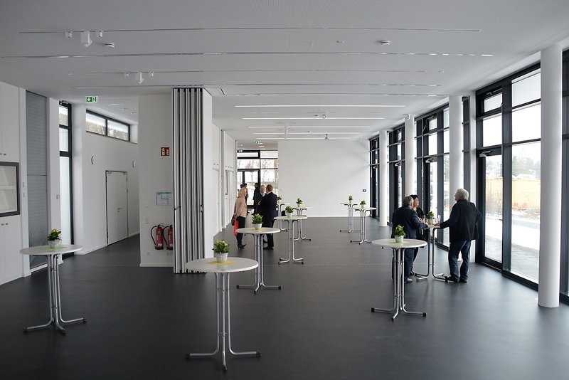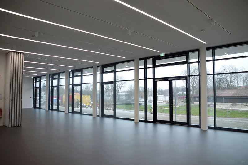 Baukonstruktion | GebäudetechnikDer Neubau wurde als hoch gedämmter Betonmassivbau mit Pfosten-Riegel-Glasfassade mit 3-Scheiben-Verglasung errichtet. Das eingeschossige Pavillongebäude erhielt ein extensiv begrüntes Flachdach. Das gesamte Oberflächen- und Regenwasser wird direkt der Ohrn zugeführt. Die Tiefgründung erfolgte mit duktilen Gusspfählen. Das nahe gelegene Blockheizkraftwerk der Stadt Öhringen beheizt den Bau über die Fußbodenflächen. Das Gebäude wird dezentral über kontrollierte Einzellüftungsgeräte mit Wärmerückgewinnung mit bedarfsgerechter Frischluft versorgt. Dies ermöglicht eine flexible Nutzung und Teilbarkeit der Räume und steigert Luftqualität und Energieeffizienz.