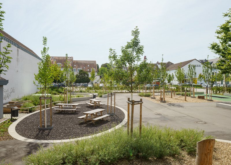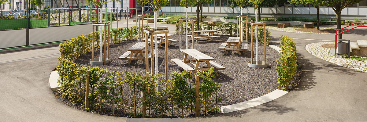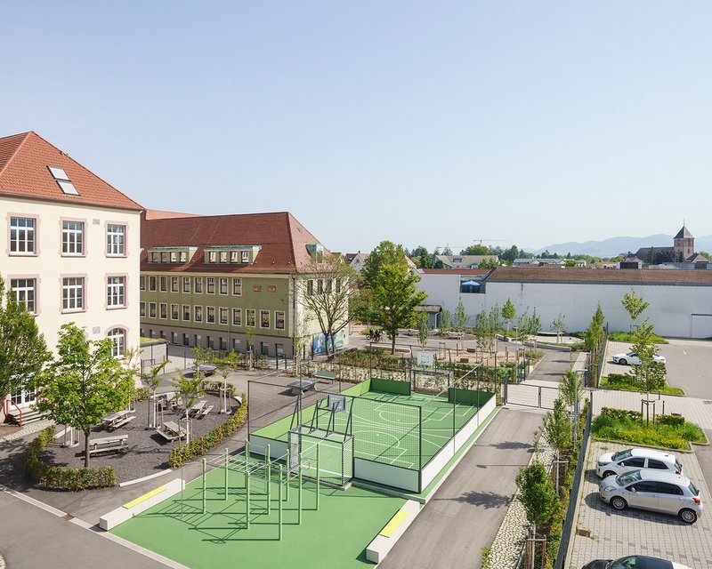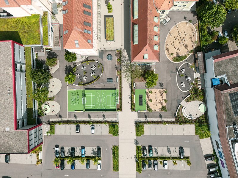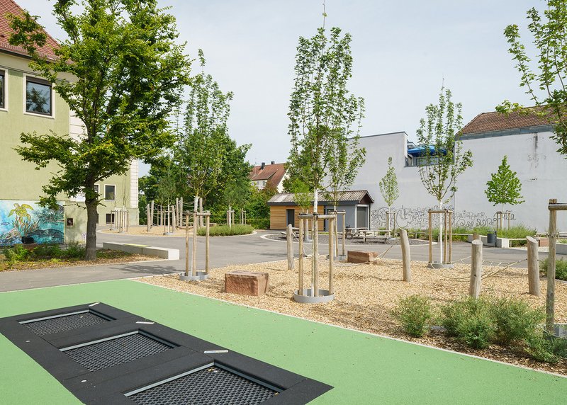 Grün statt Grau – Klima-Bäume, Flächenentsiegelung, Bauen im und mit dem Bestand & ein Farbkanon aus Grüntönen sorgen für eine friedliche Atmosphäre. Den heutigen Klimaanforderungen entsprechend, wurde ein Teil der Asphaltflächen rückgebaut und durch Rasenpflasterinseln mit großen Fugen ersetzt, in denen die Versickerung direkt vor Ort erfolgt. Zum Schutz des in die Planung integrierten Baumbestands wurden die Baumstandorte verbessert. Zusammen mit 47 neugepflanzten Klima-Bäumen sorgt er so auch zukünftig für ausreichend Schatten und Abkühlung in den heißen Monaten. Die vielfältigen Sitzmöglichkeiten und Rückzugsnischen, der Soccer Court, die Calisthenics-Anlage und das Klettergerüst bieten den Schülerinnen und Schülern während der Pausen verschiedene Möglichkeiten zum Auftanken oder Austoben. Trampoline, Tischtennisplatten, ein Grünes Klassenzimmer sowie Hochbeete für das Schulgärtnern ergänzen das Aufenthalts- und Beschäftigungsangebot des Schulhofs.