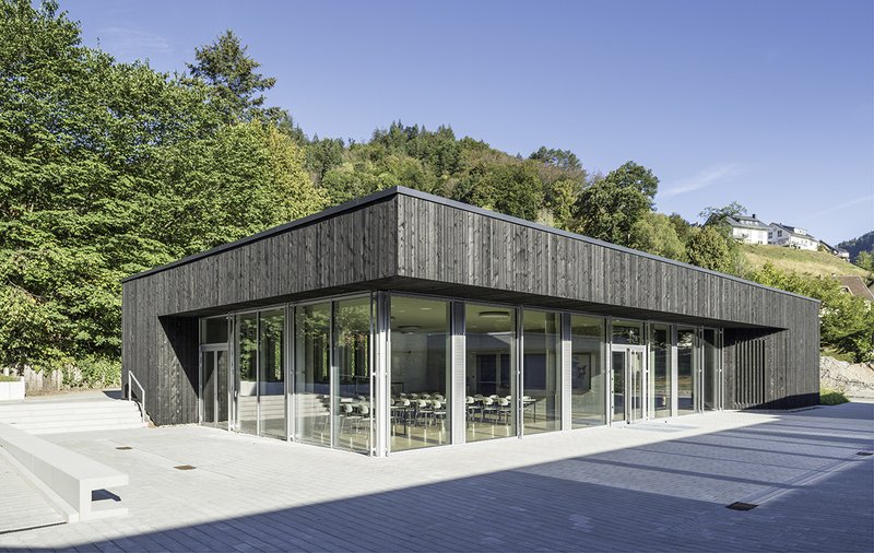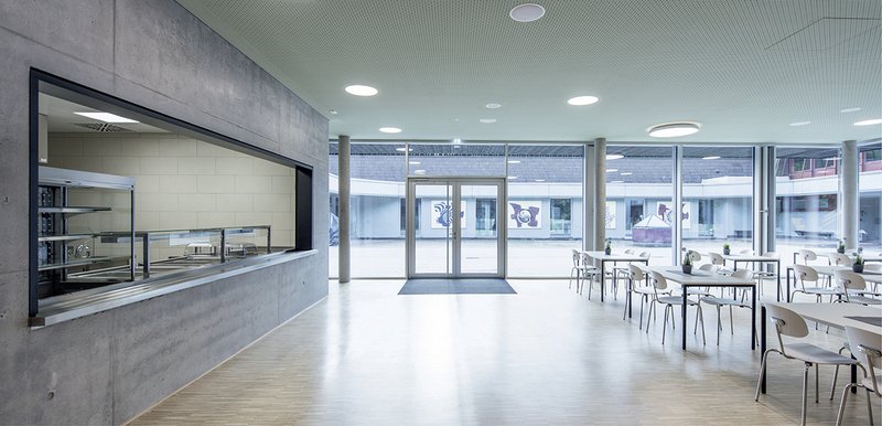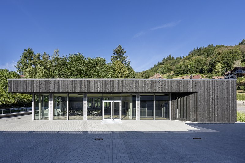 Der eingeschossige Baukörper bildet zusammen mit den angrenzenden Gebäudeteilen der Halle und der Schule einen gefassten Schulhof. Mit der raumhohen Verglasung des Mensaraumes auf der Ostseite öffnet sich das Gebäude zum Schulhof. Die übrigen Fassaden sind bewusst geschlossen gehalten und bilden mit der schwarz lasierten Holzfassade ein starkes Gegenüber zu den Bestandsgebäuden.