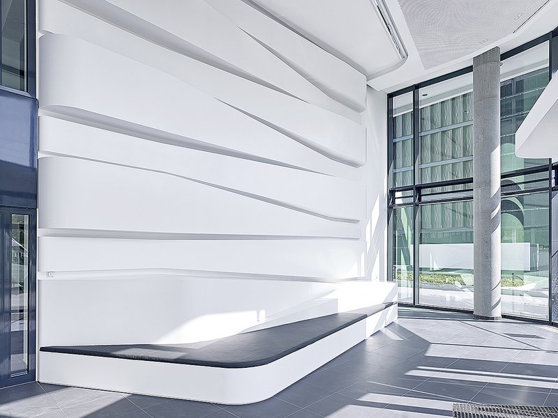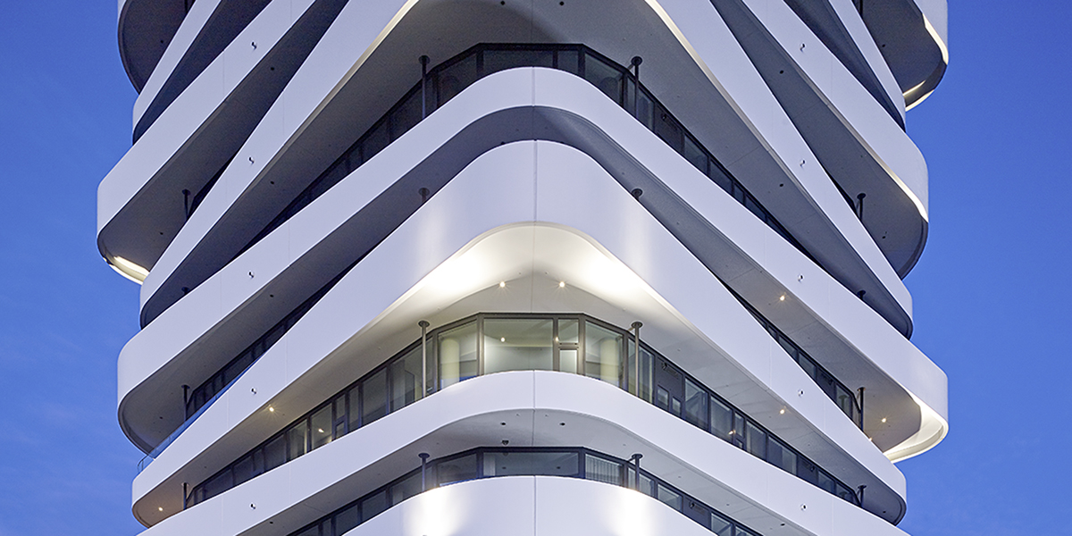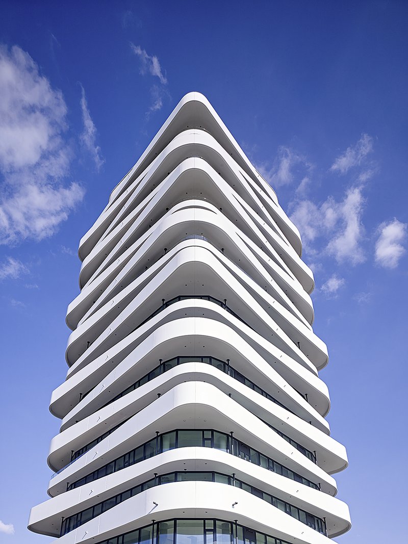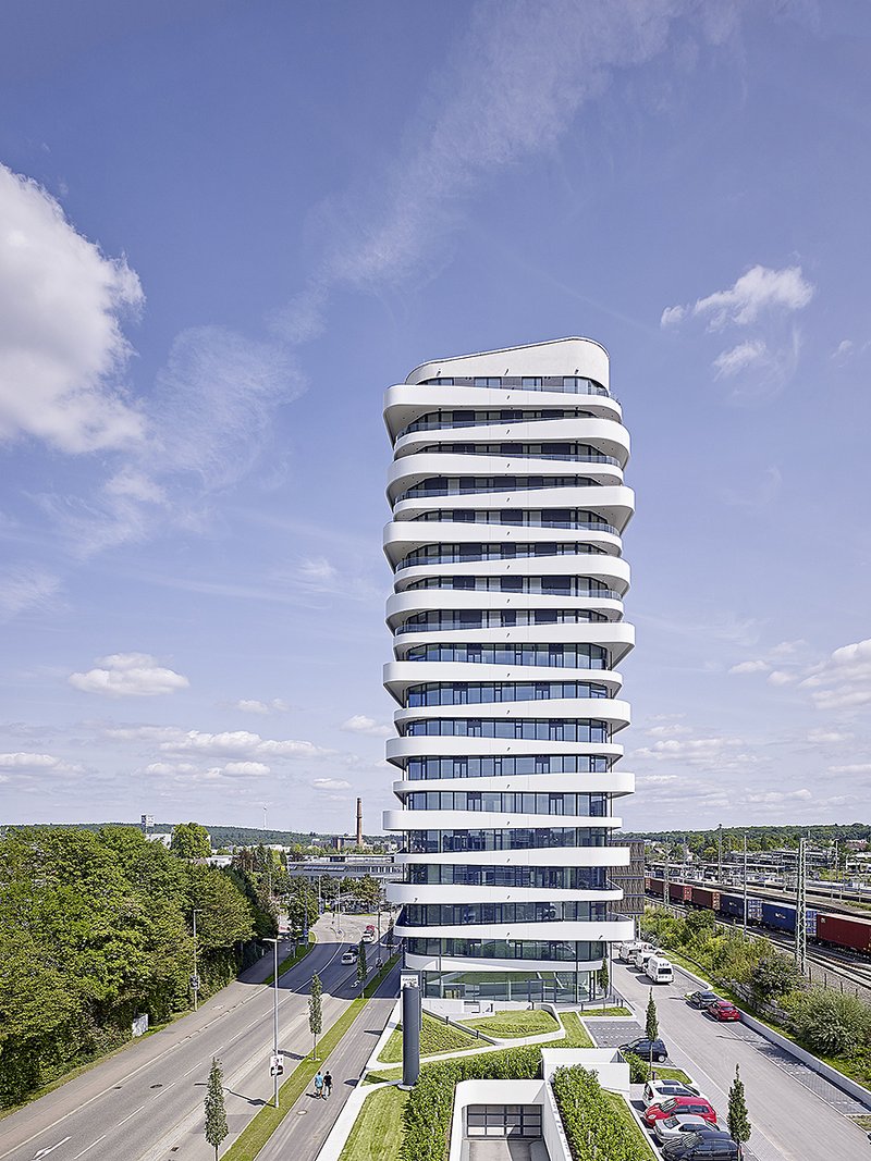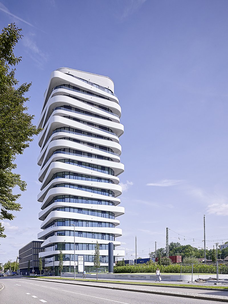 Die auskragenden Deckenplatten dienen den Nutzern als umlaufende Loggien, spielen jedoch gleichzeitig für den Brandschutz eine entscheidende Rolle. Die Hochhausrichtlinie räumt Erleichterungen für den Bau von Hochhäusern unter 60 m ein, sofern gewährleistet ist, dass der Brandüberschlag von Geschoss zu Geschoss verhindert wird. An jeder Stelle beträgt die Auskragung somit mindestens 1 m, an den Gebäudeecken weiten sich die Auskragungen zu großzügigen Balkonen auf. Für eine wirtschaftliche Umsetzung sind alle Deckenplatten gleich geformt, jedoch von Geschoss zu Geschoss um 90° gedreht, so dass ein spannendes Spiel aus sich überlagernden Loggien entsteht. Gestalterisch werden die auskragenden Deckenplatten durch in ihrer Höhe mäandrierende Brüstungen betont. Pro Geschoss setzen sich die Brüstungen aus zwölf beschichteten Betonfertigteilen zusammen, die neben gestalterischen Zwecken auch statische Funktionen übernehmen. Die zu den Gebäudeecken ansteigenden Brüstungen verhindern ein Absenken der weit auskragenden Deckenränder. Äußeres Erscheinungsbild und Funktion sind somit eng mit einander verwoben.Die unteren Büroetagen wurden mit einer Alu-Elementfassade verglast, die oberen Wohnebenen erhielten Alu-Verbundfenster, um die hohen Schallschutzanforderungen in unmittelbarer Nähe des Bahnhofs zu erfüllen. Die zurückgesetzten Verglasungen bildet mit den weiß beschichtetet Brüstungen einen spannenden Kontrast. Die organischen Formen des Gebäudes wurden in der Außenanlagenplanung nochmals aufgegriffen. Das Gebäude wurde nach den Vorgaben der DGNB-Zertifizierung Silber für nachhaltiges Bauen errichtet.