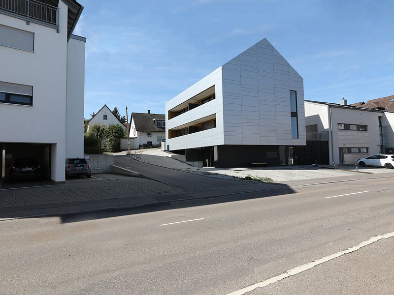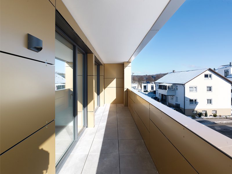 Der Hauptbaukörper wird in eine Aluminium-Plattenfassade gehüllt, welche sowohl die Fassaden sowie die Dachflächen bekleidet. Der Fassadenaufbau sieht eine thermisch getrennte Unterkonstruktion mit Dämmung aus Mineralwolle vor. Die Dachkonstruktion erfolgt ebenfalls hochwärmegedämmt, mehrschichtig mit einer Trapezblechunterkonstruktion. Aufgrund der warm reflektierenden Eigenschaften für die Wohnungsbereiche werden die Einschnitte der Loggien in einem Bronzefarbton akzentuiert. Nachhaltigkeit und EnergiekonzeptDie Wärmeverteilung erfolgt im Gebäude mit Klimaböden als Flächenheizung. Das Gebäude ist mit einer Luft-Wärmepumpe ausgeführt. Die natürliche Belüftung wird durch mechanische dezentrale Lüftungseinheiten mit Wärmerückgewinnung unterstützt. Eine passive Kühlung ist mit der Wärmepumpe in den Sommermonaten möglich. Die Eigenstromversorgung wird durch die integrierte Photovoltaik-Anlage unterstützt.