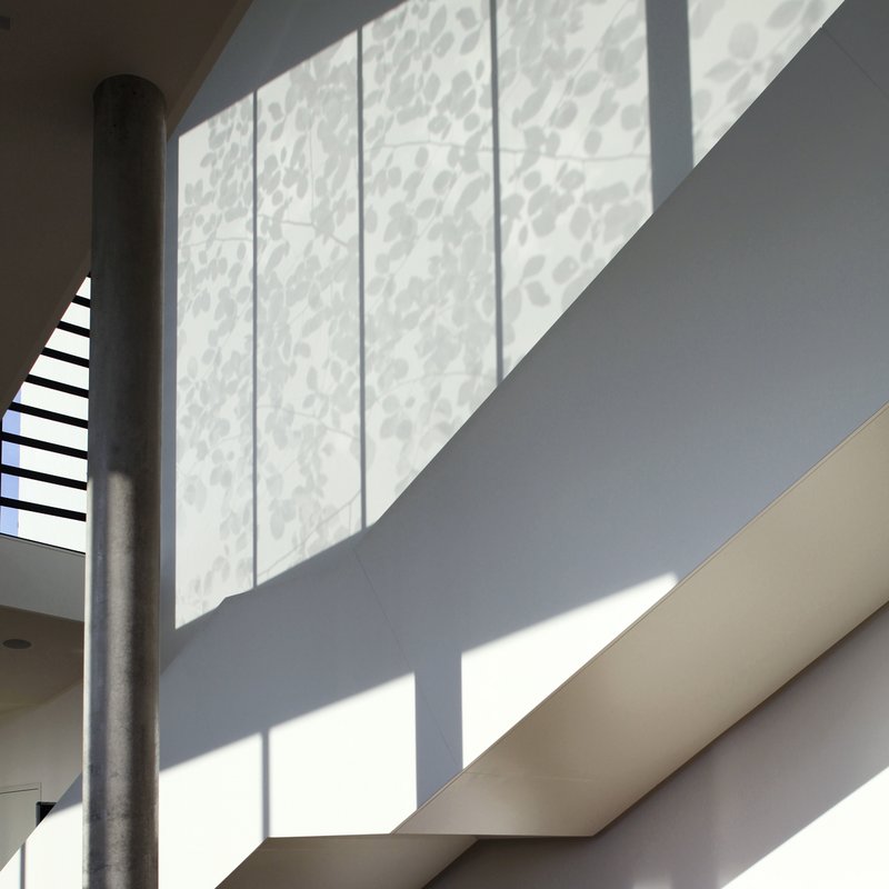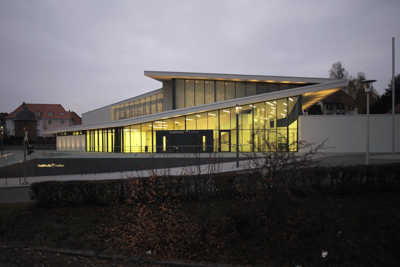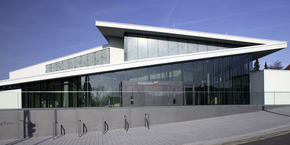 Das durch mehrfache Schrägen der angrenzenden Straßen und Bahnlinie beschnittene Grundstück gab einer konventionell kubischen Lösung nicht die Möglichkeit, sich mit großzügigem Vorplatz zur Altstadt von Buchen zu präsentieren. Ein mäanderförmiges Dachfaltwerk, welches die vorgefundenen Kanten bricht, öffnet eine Blickbeziehung über die gesamte Foyerbreite zum historischen Kern und erzeugt gleichzeitig eine skulpturale Wirkung, welches die neue Stadthalle selbst zum Blickpunkt werden lässt. Als Bindeglied zwischen Altstadt und Vorstadt fügt sie sich selbstverständlich in die heterogene städtebauliche Struktur ein.Die Komposition aus waagrechten und schrägen Ebenen erhebt sich über einer vorgelagerten Platzsituation mit qualitätsvollen Aufenthaltsbereichen, neben welcher die historische Besselkapelle an Bedeutung gewinnt. Zur Stadt hin wirkt die Halle offen und transparent, nach Norden schließt sich ihre Hülle und macht mit wenigen Öffnungen neugierig. Beim Betreten der Eingangshalle unterstreichen reizvolle Lichtführungen sowie zahlreiche Ein- und Ausblicke die Dynamik und Leichtigkeit der ansteigenden Decke, welche durch die Treppe zur Empore begleitet wird. Im gesamten Innenraum wird zur Stärkung des skulpturalen Charakters auf Farbe verzichtet. Die abstrakten hellen Ebenen werden durch zwei organische Elemente belebt, welche beide den unmittelbaren Bezug zur Stadt Buchen zeigen. Zum einen ist es das restaurierte Huddelbätz-Mosaik, das bereits in der alten Frankenlandhalle den Hauptzugang des Saales betonte, sowie das auf Glas gedruckte Buchenblattmotiv, dessen Siebdruck als Sonnenschutz wirksam wird und dessen Schatten sich an den Saal- und Foyerwänden wiederspiegelt.Energetisches Konzept: Die Halle wird von einer Pellets-Kesselanlage mit Gasbrennwertkessel zur Unterstützung bei Spitzenlast versorgt. Die Dachflächen bieten optimale Voraussetzungen für den effizienten Einsatz von Photovoltaikzellen.