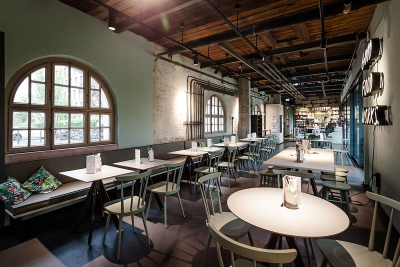 Die Metallrahmen der großen Fenster des Obergeschosses sind genau wie die Holzrahmen der Fenster im Erdgeschoss im Original erhalten, aufgearbeitet und neu gestrichen worden. Die Gläser waren fast vollständig zerstört und wurden ersetzt. Aus energetischen und nutzungsrelevanten Gründen wurden in Absprache mit dem Amt für Denkmalschutz der Stadt Heidelberg auf der Innenseite Vorsatzfenster ergänzt. Diese ermöglichen den Erhalt der Außenansicht des Gebäudes bei gleichzeitiger Behaglichkeit im Innenraum. Die Öffnungsflügel der neuen Fenster sind so angeordnet, dass auch die Öffnungsflügel der historischen Fenster weiterhin bedient werden können. Dies führt auch in diesem Bereich dazu, dass Geschichte greifbar wird.
