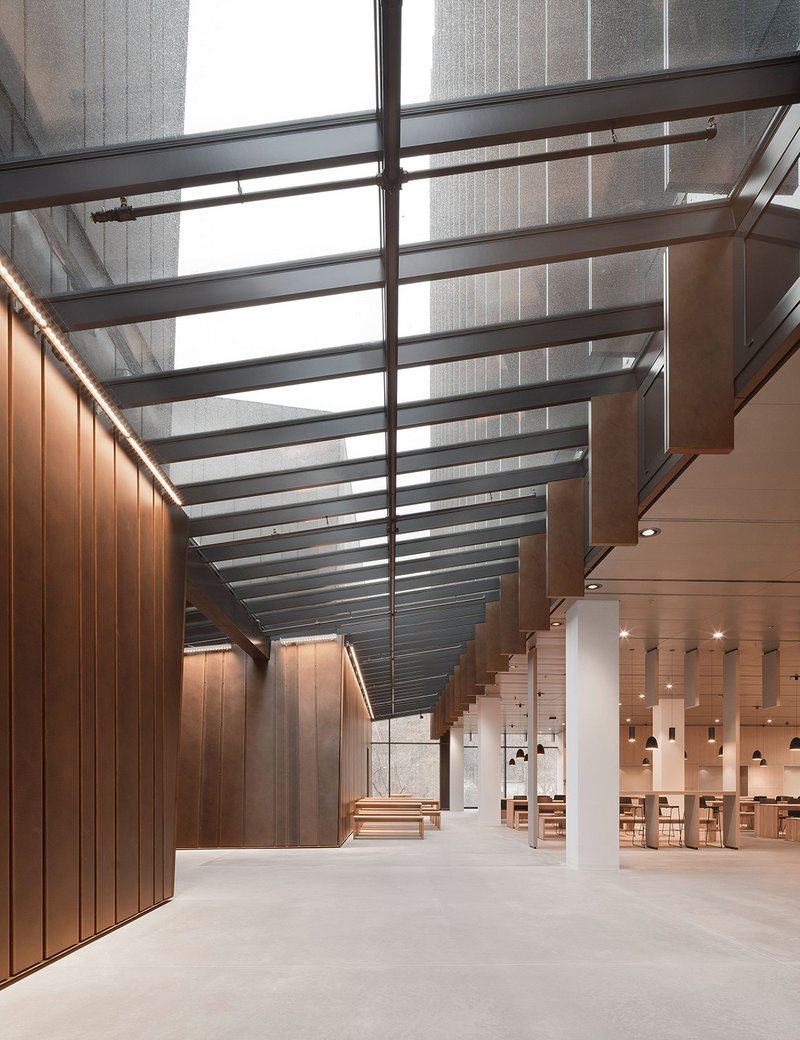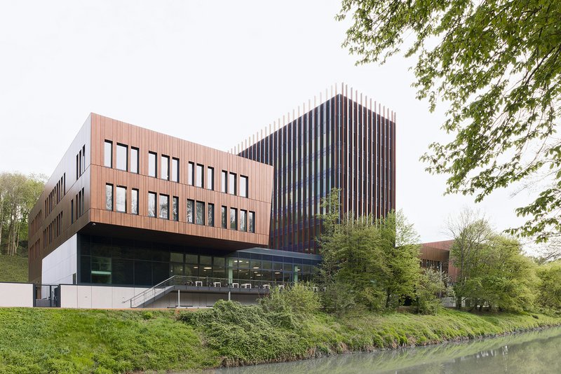 Die vorgehängte, hinterlüftete Fassade in patiniertem Messington bettet die Baukörper in den Naturraum des eng geschnittenen Tals. Die Formgebung und Materialität der Markenwelt werden auf der anderen Seite des Hochhauses im zweiten neuen Baukörper wieder aufgegriffen. Dort befinden sich Büroflächen in den Obergeschossen und das neue Betriebsrestaurant im Erdgeschoss.Ergänzt wird das Ensemble der beiden Neubauten durch das Bestandshochhaus aus den 1970er Jahren, das umfassend saniert wurde.