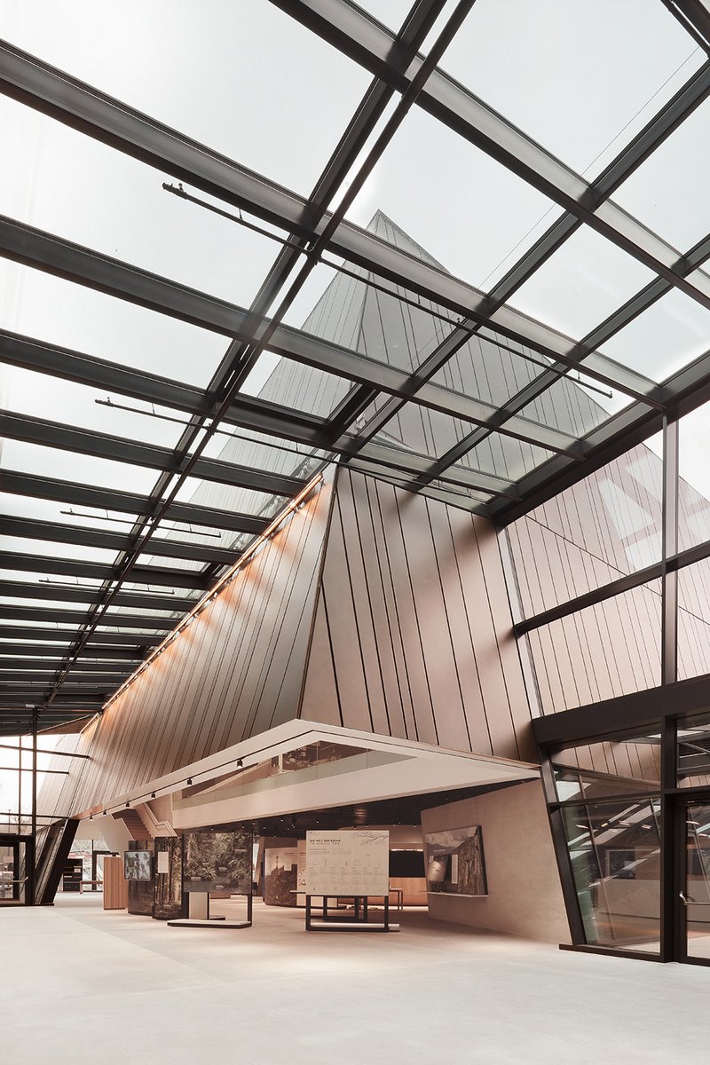 Der große Längsschnitt durch das Gebäude öffnet eine zentrale Erschließungsachse und leitet den Markenweltbesucher in die Ausstellung. Die Ausstellungsflächen erstrecken sich über drei Ebenen, die an drei tragenden Betonelementen aufgehängt stützenlos zu schweben scheinen. Von oben nach unten lässt sich die Ausstellung zu Themen wie der Unternehmensgeschichte und den Produkten erkunden. Im Erdgeschoss steht die Ausstellung im Zeichen des Waldes. Dort angekommen wird der Dialog von Ausstellung und Architektur besonders deutlich. Großzügige Verglasungen öffnen Ausblicke zu den bewaldeten Ufern der vorbeifließenden Rems. Ergänzt wird das Angebot durch einen Markenshop, ein Café, ein Kongresszentrum und flexibel nutzbare Flächen.