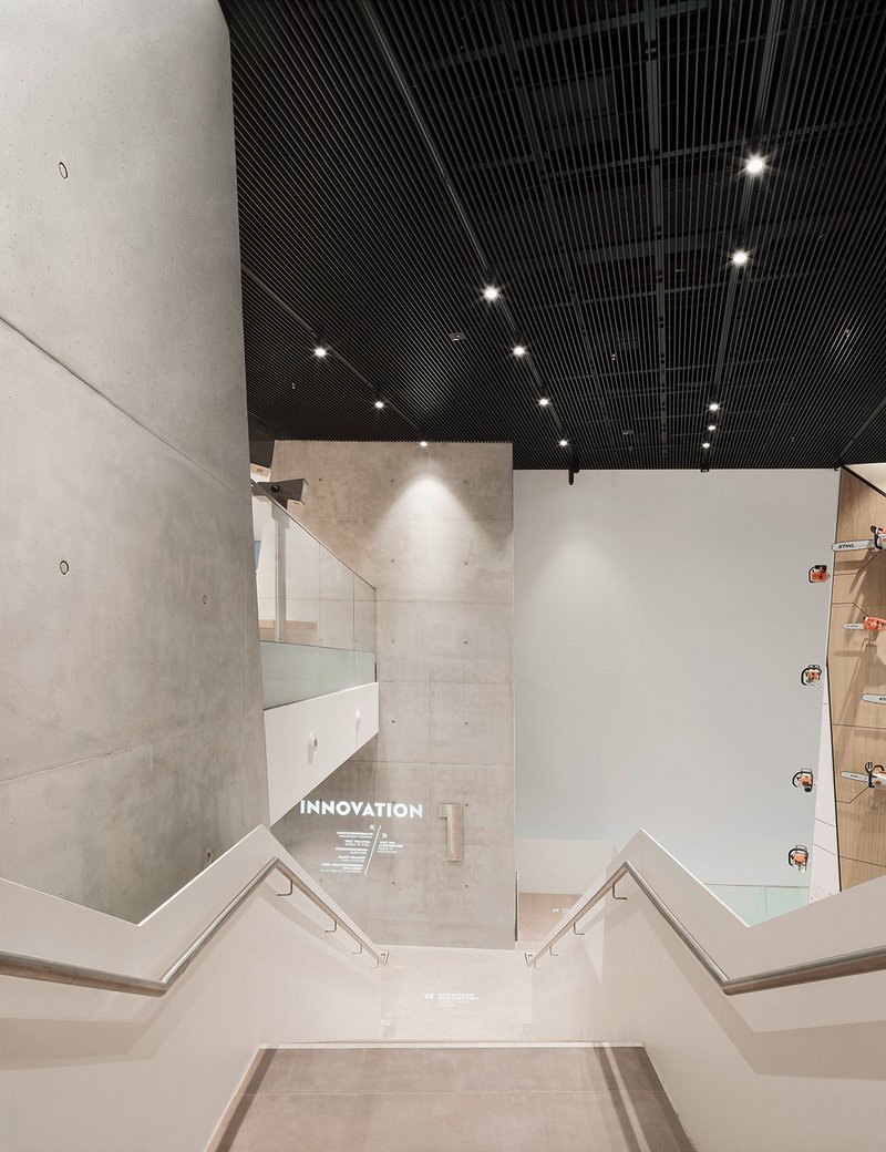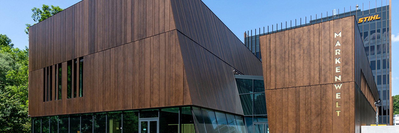Die „STIHL Markenwelt“ bildet den neuen Auftakt zum Waiblinger STIHL-Werk 1. Direkt an der Rems gelegen, liegt hier der Stammsitz der heutigen Weltfirma STIHL. Ursprünglich stand hier bereits ein Produktvorführzentrum in einer einfachen Hallenbauweise. Auf dem Untergeschoss baut die neue Markenwelt auf. Der Entwurf für die neue Markenwelt entwickelt sich aus einer durch schräg geführte Einschnitte sinnbildlich zersägten Kubatur. Die so erzeugte skulpturale Anmutung verweist dezent auf das weltbekannte Produkt des Bauherrn. Das Gebäude beherbergt Ausstellungs-, Konferenz- und Büroflächen.