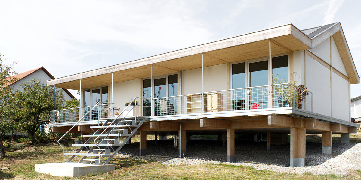Die sichtbare Holzskelettkonstruktion des vom Gelände abgesetzten Holzbaus gliedert das Haus in drei Zonen, denen auch die Nutzungen des Hauses folgen. Sie geben dem Haus Ruhe und Gleichmaß und erinnern gewissermaßen an archaische Holzbauten. Die Mittelzone ist Eingangsbereich und Verteiler im Innern. Sie führt zugleich direkt auf die Terrasse, welche talseitig auf der ganzen Hausbreite vorgelagert ist, und über eine breite Treppe in den Garten. Die Strohballenwände wurden Außen mit einem Kalkputz und im Innern mit einem Lehmputz versehen. Das Holzskelett der Konstruktion ist auch im Innern sichtbar, die Räume offen bis unter das Dach. Die Holzkonstruktion prägt die Räume, Oberlichtverglasungen verbinden diese optisch untereinander und unterstreichen die Leichtigkeit der Konstruktion.