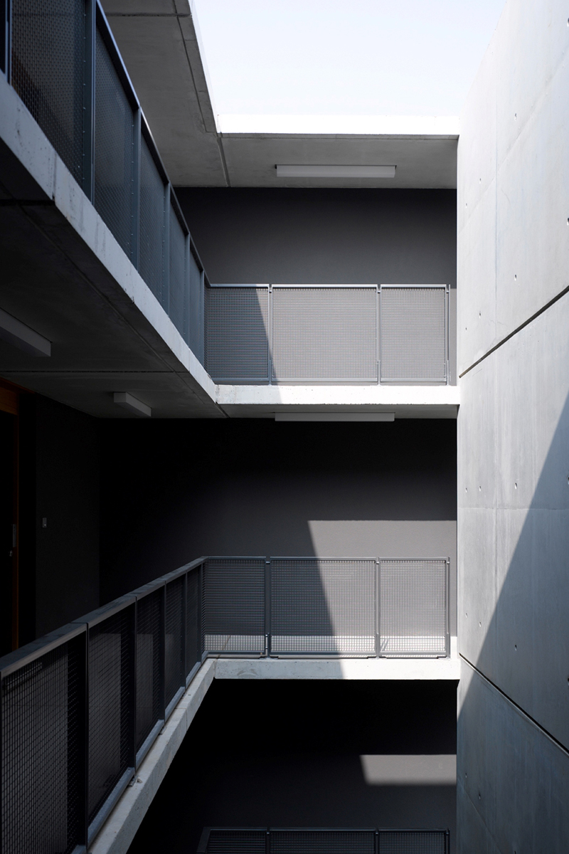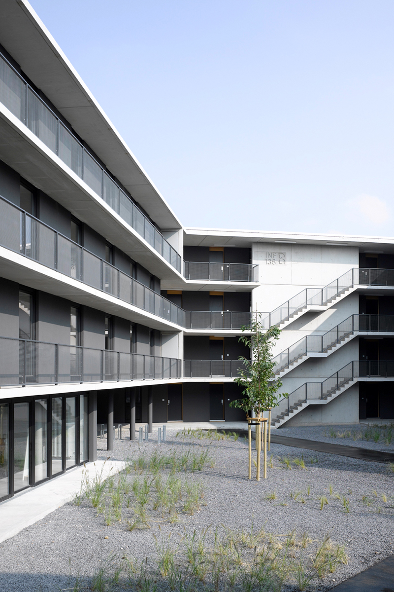 Der zentrale Hof ist nicht nur Erschließungsraum, sondern auch gemeinschaftlicher Veranstaltungsort, Treffpunkt und sich zum Ufer orientierender Quartiersplatz. Er verleiht dem Wohnheim seinen kommunikativen Charakter und wird zum Identifikationspunkt der gesamten Anlage. Hier sind gemeinschaftliche Funktionen des Wohnheims wie Musik- und Gemeinschaftsraum, Café und Teeküche angeordnet. Die beiden zentralen Treppenhäuser und die zum Freibereich orientierten Laubengänge ermöglichen kurze Wege zu den Wohneinheiten, die überwiegend aus Einzimmerapartments bestehen.