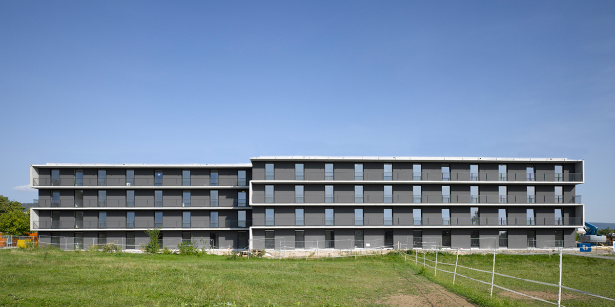 Zwei terrassierte, jeweils drei- bis viergeschossige Bauteile fügen sich zu einem kompakten Wohnkomplex zusammen. Ein Gebäuderiegel bildet den städtebaulichen Abschluss des Quartiers. Der zweite Baukörper stellt durch seine mäanderartige, gefaltete Struktur eine räumliche Verbindung zur Gebäudegruppe eines benachbarten Wohnheims her. Durch die Anordnung der beiden Bauteile entstehen zwei separate Höfe mit Blick in die freie Landschaft und zum angrenzenden Neckarufer.