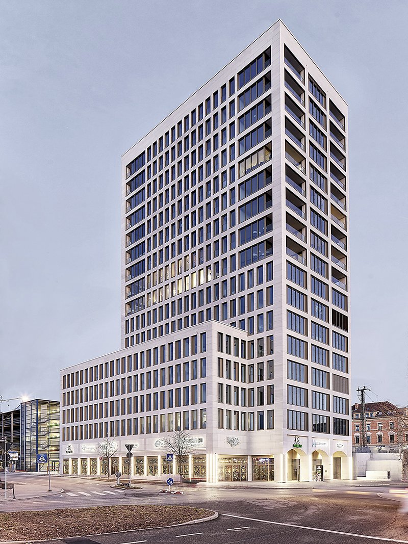 KonstruktionDas konstruktiv in Stahlbetonskelettbauweise (aussteifender Kern, Stb-Flachdecken, Stb- bzw. Stahlverbundstützen) errichtete Gebäude musste aufgrund der Nähe zur unmittelbar angrenzenden Bahnlinie mit Gleisanlagen zum Schutz vor Erschütterungs- und Sekundärschallimmissionen vollflächig elastomer gelagert/fundamentiert werden. Das Gebäude wird über Fernwärme versorgt und ist, aufgrund der Einstufung als Hochhaus bis 60 m, mit einer flächendeckenden Sprinkleranlage ausgestattet.Eine architektonische Herausforderung bestand darin, die unterschiedlichen Nutzungen über eine homogene, steinerne Fassadenstruktur zu einer Einheit zusammenzubinden. Die klassische Gliederung in Sockel, Mittelteil und Dachabschluss verleiht dem Haus, trotz seiner Höhe, eine ablesbare Maßstäblichkeit. Die in der Entwurfsphase angedachte, hochwertige Materialwahl für die Fassaden (hellbeiger Kalksandstein in Kombination mit hellbronzefarbenen, hochdämmenden Glas-Alu-Elementen) konnte auch in der Umsetzungsphase durch einen GU realisiert werden.