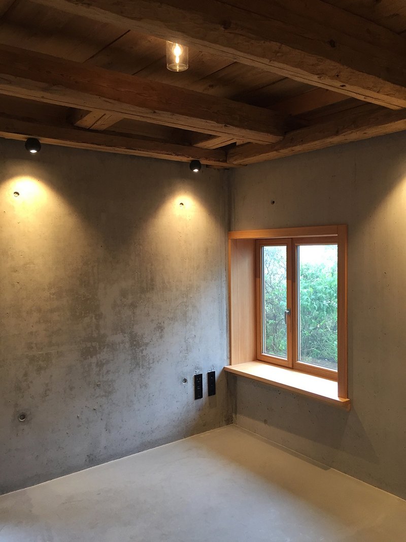 SockelgeschossDas historische Mauerwerk des Speichers konnte nicht transloziert werden, es musste ein zeitgemäßer und dennoch angemessener Ersatz gefunden werden. Der moderne Baustoff Beton interpretiert den historischen Sockel, in den Abdrücken der Schalbretter zeigt sich die Verbindung zu dem aufliegendem Holzbau. Die Konstruktion der zweischaligen Sichtbetonwände erlaubte den Einbau des historischen Türgewandes. Die historische Kellertür wurde aufgedoppelt und wieder eingesetzt – mit einem Holzgelenk wie einst üblich. Alle weiteren Materialien folgen dem Prinzip der Nachhaltigkeit und der Bautradition im Schwarzwälder Kulturraum.
