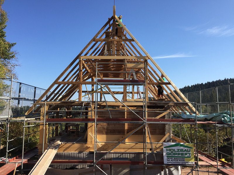 Konstruktiver HolzschutzFür die Holzbaukunst im Schwarzwald war und ist der konstruktive Holzschutz bestimmend. Das Schadensbild bei Befund machte die Schwachpunkte des Kornspeichers sichtbar. Dazu gehörten Kontakt mit Erdreich und eine extrem bewitterte Rückfassade, die seit der ersten historischen Translozierung nur mangelhaft geschützt war. Die neue Deckleistenschalung wird zwar weiter stark bewittert und vergraut, ist aber nun gut belüftet und durch Vorsprünge und unter schützendem Dach vor ständiger Nässe geschützt. Im Bereich der Galerie werden die Balkenköpfe der Tragstruktur zwischen UG und EG von den Brettern der Balustrade wieder adäquat geschützt.