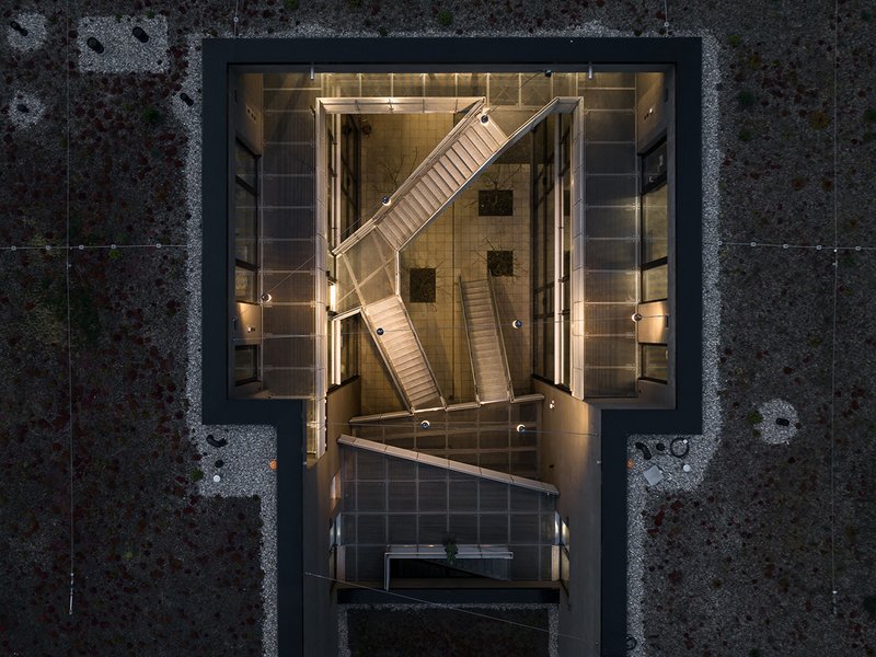 Die beiden Gebäudeteile im Osten und Westen begrenzen einen Zwischenraum von acht Metern Breite, der durch unterschiedliche Verbindungsvolumen in den Stockwerken im Süden und im Norden einen gefassten Innenhof bilden. Von der Umgebung betrachtet entsteht so ein Baukörper von ca. 35m x 37m. Im Inneren befindet sich ein geschlossener Innenhof, in dem Bäume für Grün und Schatten sorgen. Über eine skulptural ausgeformte Stahltreppe erreicht man vom Hof aus alle Ebenen. Das Gebäude ist teilunterkellert.