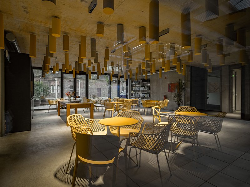 ErschließungMan betritt das Gebäude von Norden in der Erdgeschossebene in der vollen Breite des Innenhofes über einen Durchgang. Nach dem Durchschreiten des Innenhofes erreicht man im Süden den Hauptzugang ins Gebäude. Hier empfängt eine Cafeteria alle Nutzer. Die einzelnen Einheiten werden von hier in einer offenen Weise erschlossen. Die baurechtlich notwendige Treppe im Innenhof ermöglicht die offene Raumabfolge über alle Ebenen.