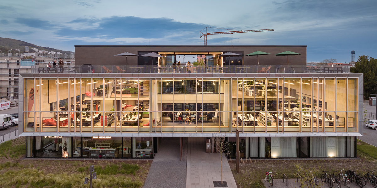 Angaben zum GebäudeBauweise: Gedämmter Stahlbetonbau mit Pfosten Riegel Fassade und hinterlüftete Stahlblechfassade, 3mm feuerverzinktMaterialien: Beton, Estrich, Fichte, Schwarzstahl unbeschichtet im Innenbereich, Stahlprofile und Stahlblech feuerverzinkt im AußenbereichEnergiekonzept: Stahlbetonmassivdecken mit Bauteilaktivierung, Kühlung durch Grundwasser, FernwärmeBarrierefreiheit: Das Gebäude ist über einen Aufzug barrierefrei erschlossen.Klimaanpassungsmaßnahmen: Freiflächen rund ums Gebäude unversiegelt. Dachbegrünung und Rigole schließen ein abführen von Regenwasser in die Kanalisation aus, Dachbegrünung schafft lokale Verdunstungskälte. Kühlung mittels Grundwasser, mit drei Brunnenbohrungen, Energiekosten entstehen nur für die Zirkulation. Reduzierung des Bauvolumens durch organisierte gemeinsame Nutzungsbereiche.