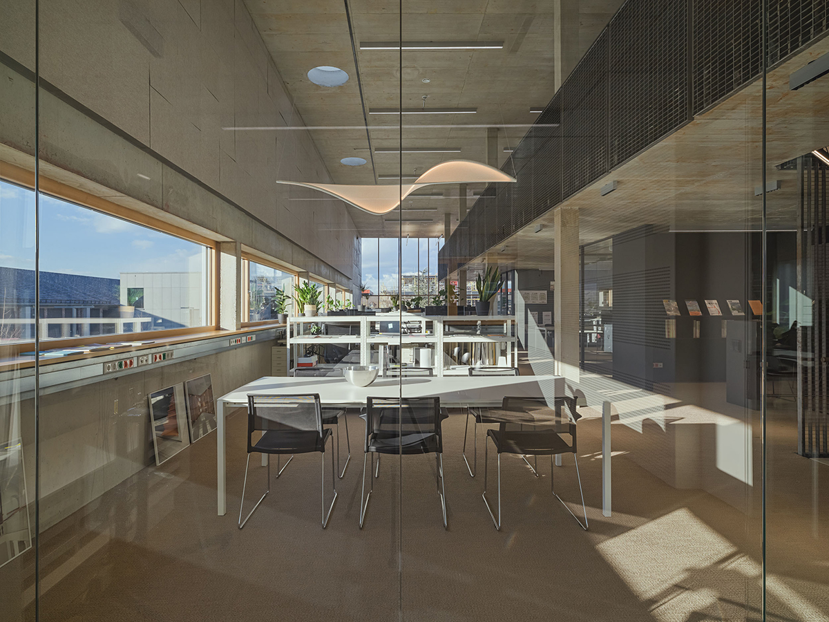 Im Dachgeschoss gibt es eine große gemeinsam genutzte Lounge für alle Mitarbeiter und Mitarbeiterinnen mit anschließender Dachterrasse nach Norden.Im Untergeschoss befinden sich Haustechnikräume, Lagerflächen, eine WC-Anlage und Umkleiden mit Duschen.