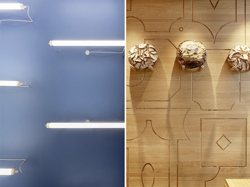 Der Einsatz nachhaltiger LED-Leuchten erforderte bewusst gewählte Lichtfarben und Lichttechniken zur Unterstützung der kontrastierenden Raumstimmungen: Kaltweiß und freistrahlendes Licht für die Backstube, warmweiß und gerichtetes Licht für den Verkauf verleihen dem Gegensatz die besondere Prägnanz. Das Besondere zeigt sich auch in der Verbindung von Architektur und Kommunikation, der gemeinsamen Entwicklung des Konzepts von Architektin und Kommunikationsdesigner. So zieht sich zum Beispiel das gefräste Muster durch alle analogen und digitalen Medien hindurch und wird je nach Anwendung unterschiedlich interpretiert.