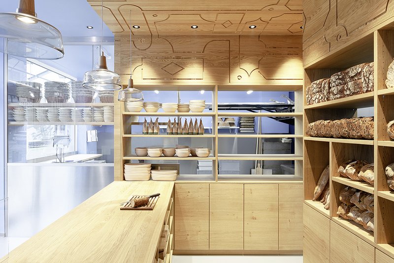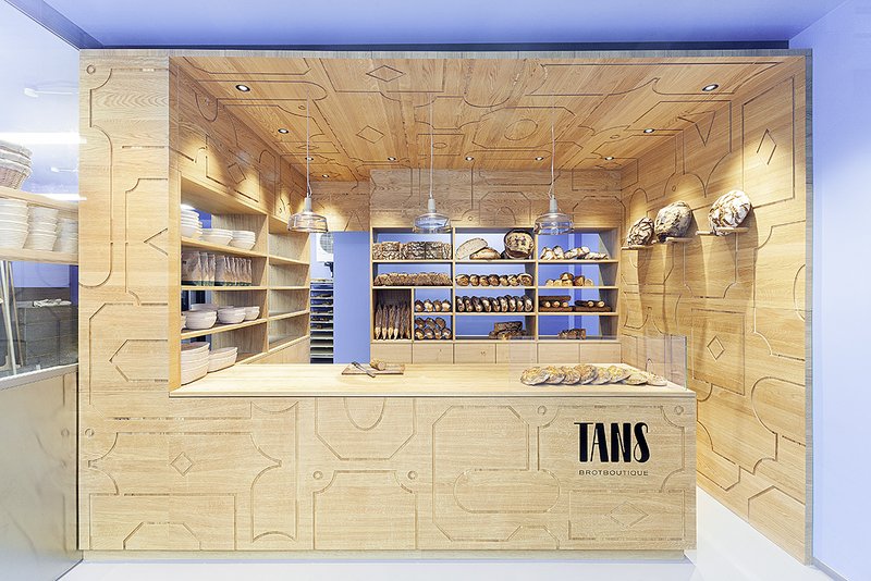 Die Umsetzung entwickelte sich aus dem Raum-im-Raum-Prinzip. Die Kundschaft betritt die in eisblau und Edelstahl ausformulierte Hülle der gläsernen Bäckerei, in die sich der Kern als Holz-Kubus aus Eichenholz legt. Direkt aus dem Backofen können die Brote in die offenen Regale geschoben werden. Eine große Glasscheibe trennt aus hygienischen Gründen den Kunden vom Arbeitsbereich, lässt jedoch Einblicke zu, die dem Kunden das Gefühl geben, in der Backstube zu stehen und dem Bäcker beim Backen zuzuschauen.Die Muster im Eichenholz wurden in Anlehnung an klassische Kassettenverkleidungen mit aufgesetzten Zierleisten entwickelt und als Fräsungen in die Moderne übertragen. Sie bilden eine Reminiszenz an die Ornamentik der Gründerzeit und werden gleichzeitig zeitgenössisch interpretiert. Das Muster als Symbol für die Kunst des Backens, die schon in Vergessenheit geraten war, aber heute wieder mehr denn je gefragt ist.