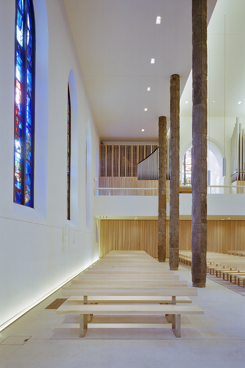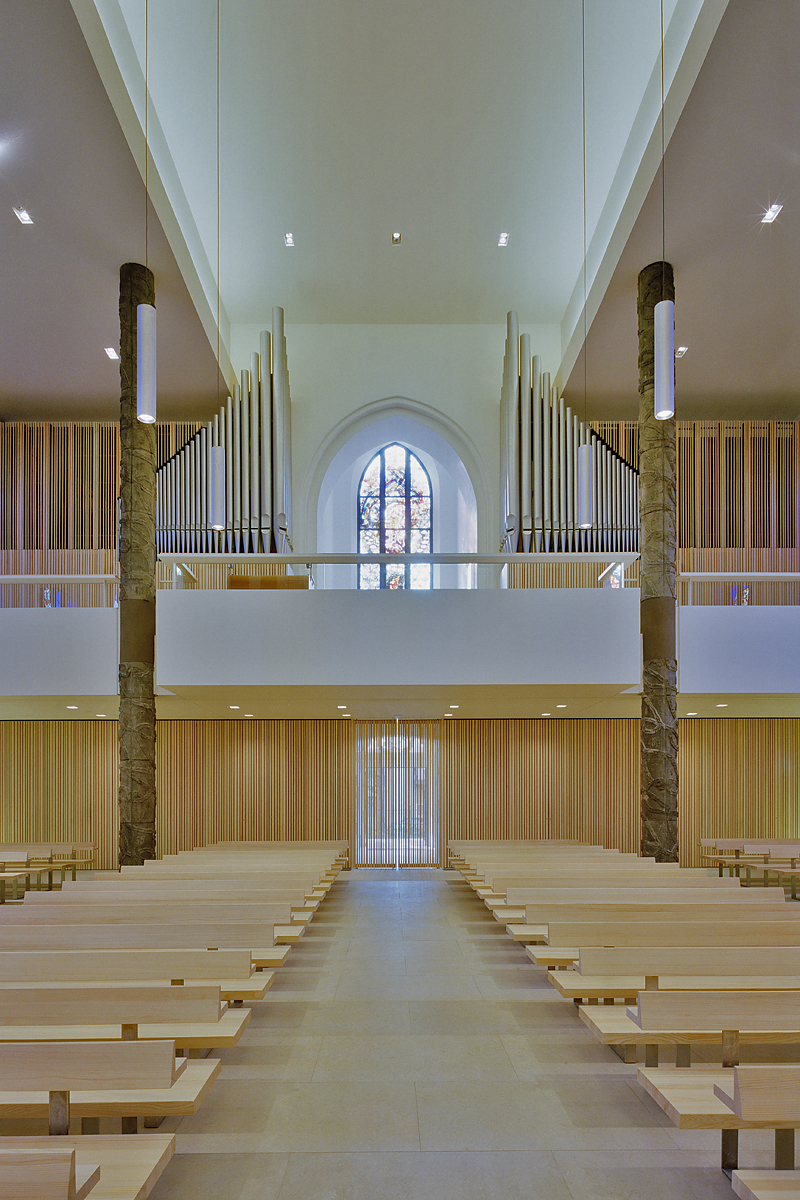 MÖBLIERUNGKürzere Bänke aus Weißtanne ermöglichen eine ruhige Raumstimmung, gleichzeitig Flexibilität, Füße aus Edelstahl halten den Boden frei und ermöglichen Lesbarkeit des Bodens. Altartisch aus heller massiver Weißtanne, Kanzel als leichte, filigrane Stahlkonstruktion mit Ahornbuchauflage, Kerzenständer aus filigraner Stahlkonstruktion.