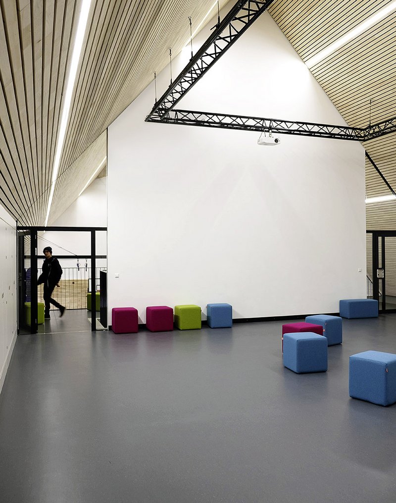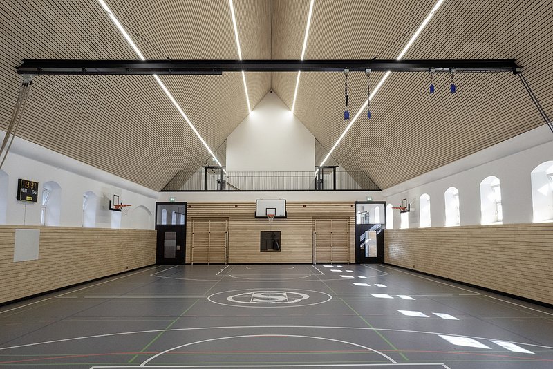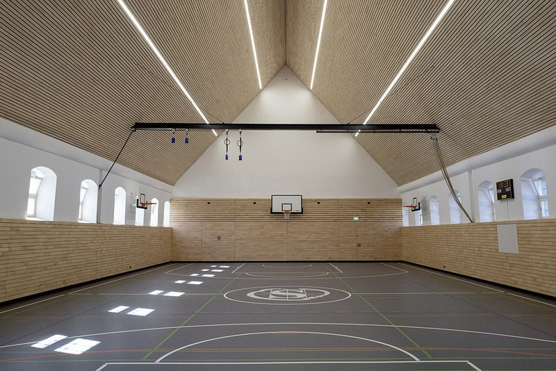 Ziel des Entwurfes war, das Gebäude in seiner Ganzheit erlebbar zu machen. Sichtachsen wurden geschaffen, die Blickbezüge vom Foyer bis an das Ende der Halle ermöglichen. Umkleiden und Sanitärräume wurden als freistehender Block zwischen Foyer und Halle integriert. Das Dach wurde als verbindendes Element der Bereiche Fitnessraum – Foyer – Gymnastikraum – Sporthalle herausgearbeitet. Die Dachuntersicht ist mit einer akustisch wirksamen Bekleidung aus sägerauher Weisstanne versehen, eine energiesparende LED-Beleuchtung wurde flächenbündig integriert.