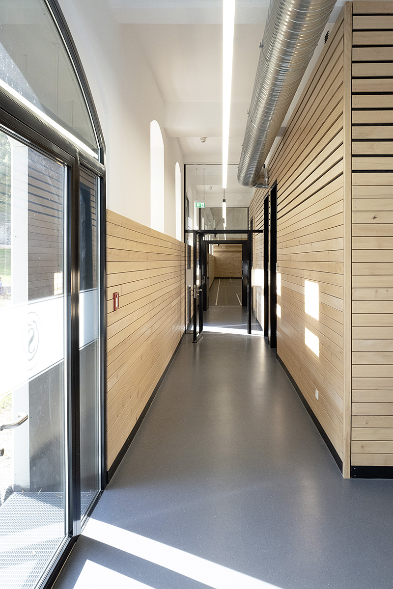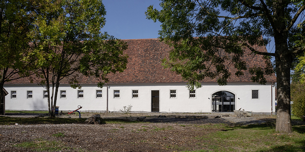 Im Foyer wurde die Bestandsdecke zurückgebaut. So ist eine zweigeschossige Erschließung entstanden, die den Blick bis nach oben ins Dach freigibt. Das Bestandsgebäude wurde dabei baulich umfassend modernisiert, das äußere Erscheinungsbild blieb mit Rücksicht auf den Denkmalschutz weitestgehend erhalten. Die vorhandene, komplett ungedämmte Dachkonstruktion wies im Bereich des Heubodens Stützen und im Bereich der Halle Spannelemente aus Stahl auf, beides wäre bei der vorgesehenen Nutzung hinderlich gewesen und wurde daher zurückgebaut und durch einen neuen Dachstuhl ersetzt. Die vorhandene, historische Dachdeckung wurde wiederverwendet.