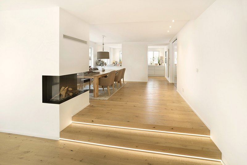 Im Inneraum dominieren natürliche, einfache und haptische Oberflächen. Die Räume wirken für sich. Herzstück des Wohn-/Esszimmers bildet der neue, raumteilende Gaskamin mit 3-seitiger Glasfront.