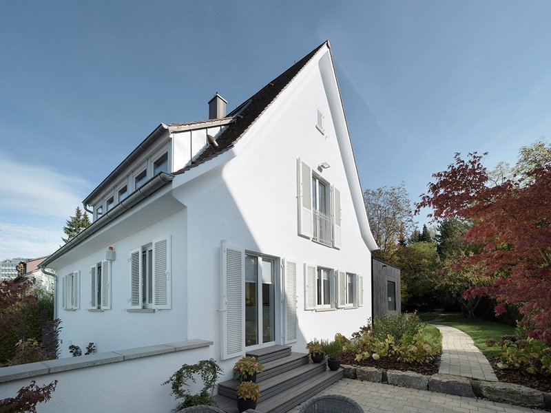 Die Idee der äußeren Gestaltung war der Erhalt des Hauscharakters, der Freilegung und Hervorhebung bisheriger Qualitäten. Das Bestandsgebäude wurde zurückhaltend in Form einer neu verputzten, weiß gestrichenen Fassade und weißer Fenster mit weißen Klappläden gestaltet. Der Anbau auf der Gartenseite hierzu als modernes, kontraststarkes Element wurde mit einer schwarz geflammten (Shou-Sugi-Ban-Technik), vertikalen Lärchenbretterschalung und schwarzen Fenstern ergänzt.