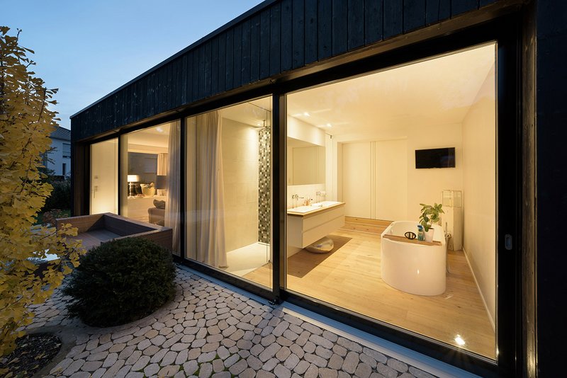 GebäudeZiel der Umbaumaßnahme war von Bauherrenseite eine möglichst ebenerdige Nutzung der Gartenebene sowie die Ansiedlung der Wohnräume und des Elternschlafzimmers mit Bad im Erdgeschoss. Hierfür war eine Flächenerweiterung notwendig; auf der Gartenseitige wurde ein eingeschossiger Anbau realisiert. Die baulichen Vorgaben ergaben sich aus dem Bebauungsplan und der Gestaltungssatzung der Stadt.