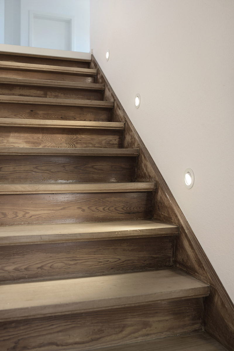 Entsprechend lag der Umbau-, Erweiterungs- und Investitionsschwerpunkt auf dem Erdgeschoss. Ziel war eine größtmögliche Offenheit und Transparenz in der Grundrissgestaltung sowie der funktionale und visuelle Zugang möglichst aller Räume zum Garten und den Freiflächen.Hierfür wurden bestehende Wände großzügig abgebrochen, bei tragender Funktion wurden diese durch Stahlträger und -Stützen ersetzt. Die Fassade des Anbaus erhielt eine größtmöglich verglaste Schiebetüranlage zum Garten. Der Anbau mit Wohnzimmer und Bad liegt auf Gartenniveau und ca. 60 cm tiefer als das Bestandsgebäude. Der enstandene Höhenunterschied wurde im Innenraum in Wohnzimmer und Bad mittels Stufen hergestellt, was zu einem Gewinn der lichten Raumhöhe und unterschiedlichen Raumqualitäten führt. Die Geschosse UG, DG und Spitzboden (SB) wurden saniert, renoviert und ergänzt.