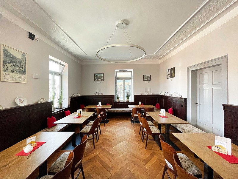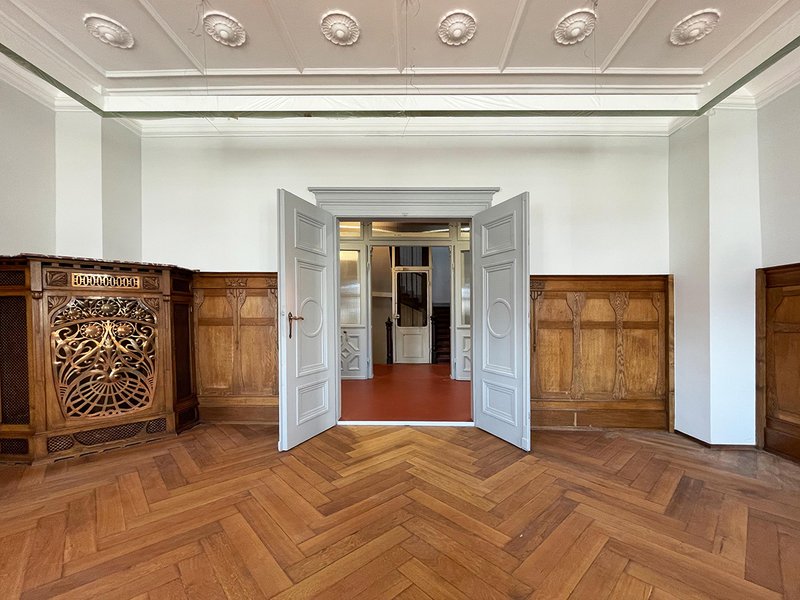 Die Gliederung orientiert sich am historischen Bestand. Der Innenausbau richtet sich nach den vorhandenen Materialien und Farben. Böden, Türen und Stuckdecken blieben erhalten und wurden aufgearbeitet. In den Bereichen die schon neuzeitliche Beläge aufweisen, sind Linoleum oder Parkett zum Einsatz gekommen.
