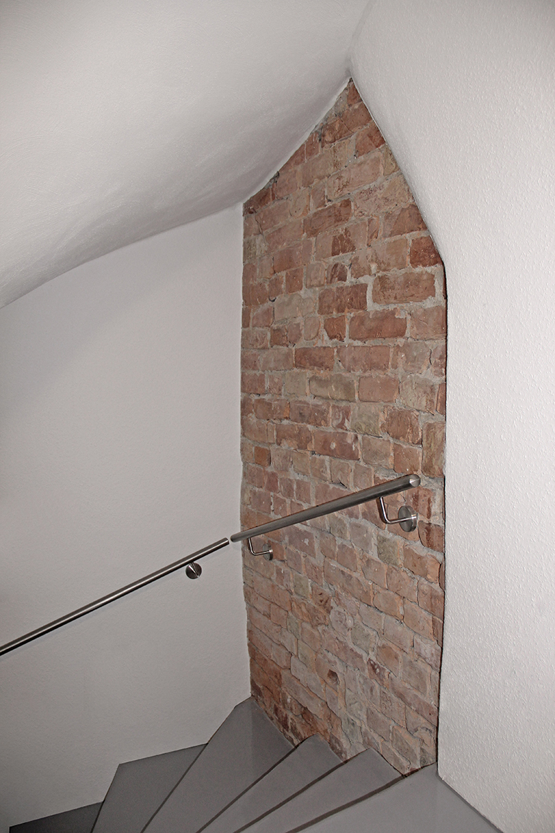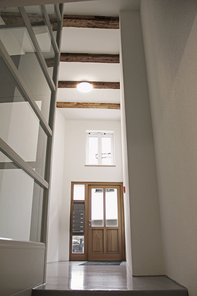 In die alte Gebäudesubstanz wurde mehrfach massiv eingegriffen. So wurde 1911 durch einen Brand der Dachstuhl zerstört. In den 50er-Jahren wurden die obersten drei Geschosse (Erstes und zweites Dachgeschoss sowie drittes Obergeschoss) erneuert. In den darunterliegenden Geschossen wurde die Statik durch den Einbau zahlreicher Stahlträger und Stützen verändert. Das Haus steht nicht unter Denkmalschutz. BauphaseDie Sanierungsarbeiten gestalteten sich sehr schwierig. Da es sich um einen privaten Bauherrn handelt, war ein wesentlicher Teil der Planungsaufgabe die Einhaltung des Kostenrahmens.