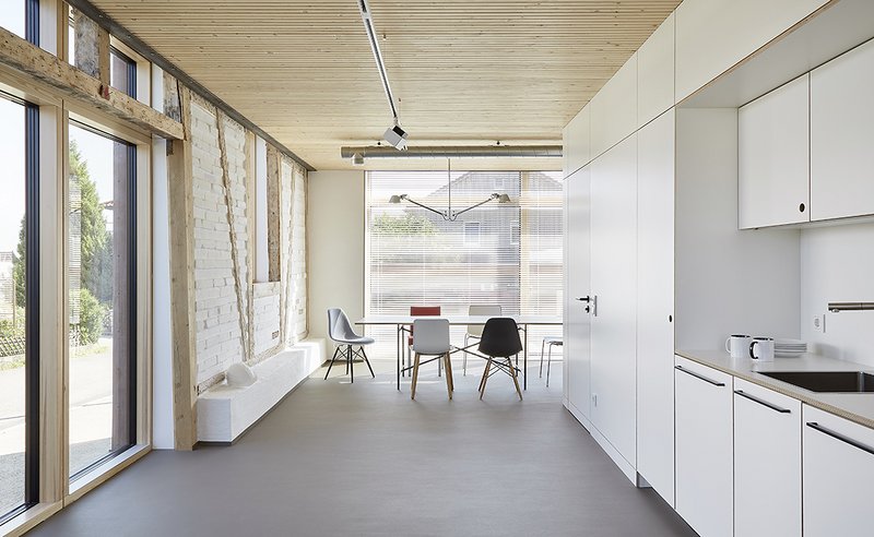 Der ursprünglich offene Hallenraum wurde mit zwei Zwischenebenen aus Brettstapeldecken versehen, um die erforderlichen Flächen unterzubringen. Der Innenausbau und die Treppen vom Erd- in das Obergeschoss sind aus Siebdruckplatten gefertigt. Ein industriell gefertigtes Material, das normalerweise im Betonschalungs- und Fahrzeugbau seine Anwendung findet. Die Treppen in das Dachgeschoss sind aus rohem Gitterrost gefertigt, um Tageslicht durchdringen zu lassen und die ursprüngliche Höhe des Raumes erlebbar zu machen. Weil das Gebäude nicht unterkellert ist, wurden die Trennwände als beidseitig nutzbare Schrankmöbel ausgebildet, um den nötigen Stauraum zu schaffen.