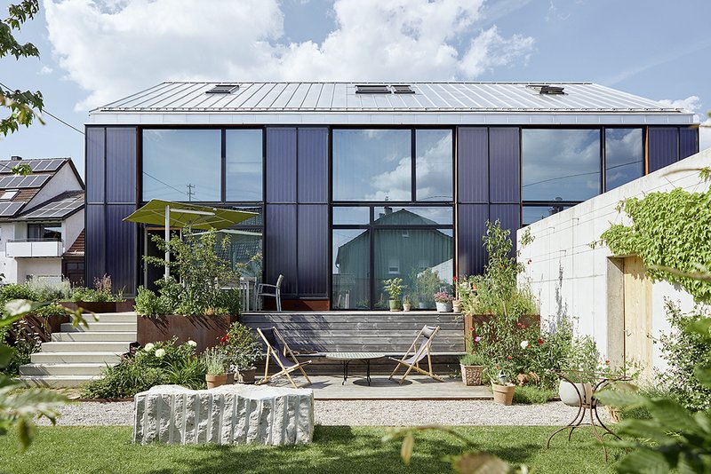 Im Außenbereich wurde das Bestandsgebäude durch einen freistehenden Anbau für Carport und Lagerraum ergänzt. Die Bodenplatte des einstigen Anbaus für Umkleiden und Duschen – einst später an den Bestand angefügt und jetzt entfernt – dient als Untergrund für ein Holzdeck, das über die gesamte Gebäudelänge führt. Der Zugang zum Gebäude und das Erdgeschoss sind barrierefrei gestaltet.