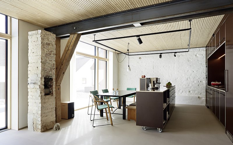 Überhaupt war der Bauherrschaft und den Architekten wichtig, die Materialen als solche, in ihrer rohen Form, Oberfläche und Farbe wirken zu lassen. Die Ausfachungen der Fachwerkwand wurden mit Kalkputz verschlämmt. Die Zwischenwände sind mit einer Kalkglätte versehen. Die Fußböden aus Korklinoleum bilden den Untergrund für ein angenehmes Barfußgefühl.