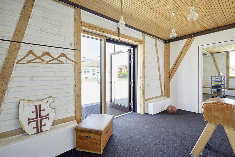 Die Gemeinde unterstützte dieses Vorhaben und nahm das Vorhaben in das bestehende Sanierungsgebiet mit auf. Unter anderem dadurch war es möglich, den angestrebten Erhalt der teilweise sehr maroden Bausubstanz zu schaffen. Absicht war, die Historie des Gebäudes fühlbar zu machen: nach außen als Baustein der alten und gewachsenen dörflichen Struktur, nach innen durch das Freilegen der Fachwerkkonstruktion und des Holztragwerks. Die äußeren Abmessungen blieben erhalten, um die Wiedererkennbarkeit zu gewährleisten. Die ursprünglichen Fensteröffnungen wurden wiederhergestellt. Ein neues Kleid aus anthrazitfarbenem Fassadennetz verhüllt den Bau, ohne die Proportionen zu ändern.