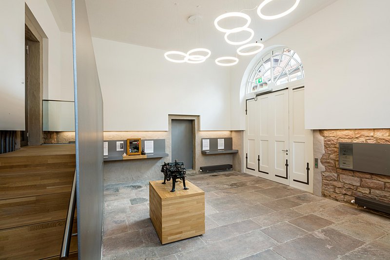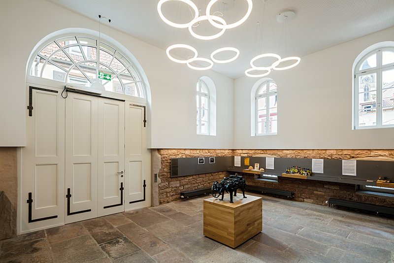 Zu diesem Zweck wurde die Fahrzeughalle komplett saniert, der historische Sandsteinboden wieder hergerichtet und der untere Teil der Wände gestrahlt. Im oberen Teil des ca. 4,50 m hohen Raumes wurde eine weiße glockenähnliche Innenverkleidung eingebaut. Diese dient zum einen der Wärmedämmung des Raumes, bildet aber gleichzeitig im unteren Abschluss eine Beleuchtungsebene für die Ausstellungsvitrinen im gestrahlten Sandsteinbereich.