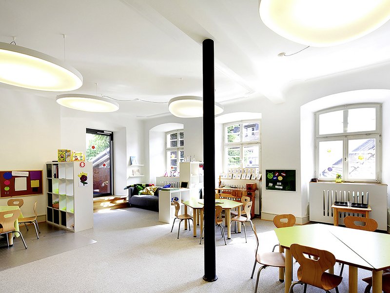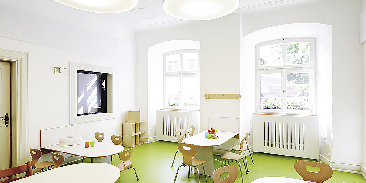 Schallschutz: Schalldämmmaßnahmen wie in Kindergarteneinrichtungen üblich konnten aufgrund der Stuckdecken mit Rhomben, Ovalen und Bandelwerk nicht im Deckenbereich flächendeckend ausgeführt werden. Eine besondere Deckenlampenausführung mit einer schallabsorbierenden Stoffbespannung stellte eine Teillösung dar. Weiterhin mussten Holzfußbodenbereiche mit Teppichboden zur Schallreduzierung belegt werden.