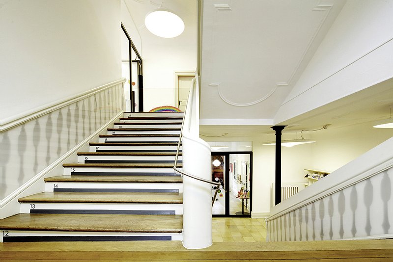 Unfallschutz: Der Klemmschutz konnte bei den alten Bestandstüren natürlich nur sichtbar montiert werden. Ebenfalls mussten die vorhandenen Treppenbrüstungen erhöht werden. Gleichzeitig war das vorhandene Balustradengeländer nach den Denkmalvorschriften verpflichtend zu erhalten. Die Lösung wurde mit einer höheren Extrabrüstung und der transparenten Verkleidung der Balustradenaussparungen gefunden. Die gefährlichen "Kopffangstellen" sind noch sichtbar, aber die Konstruktion entspricht vollkommen den Unfallvorschriften für Kindergartengebäude.