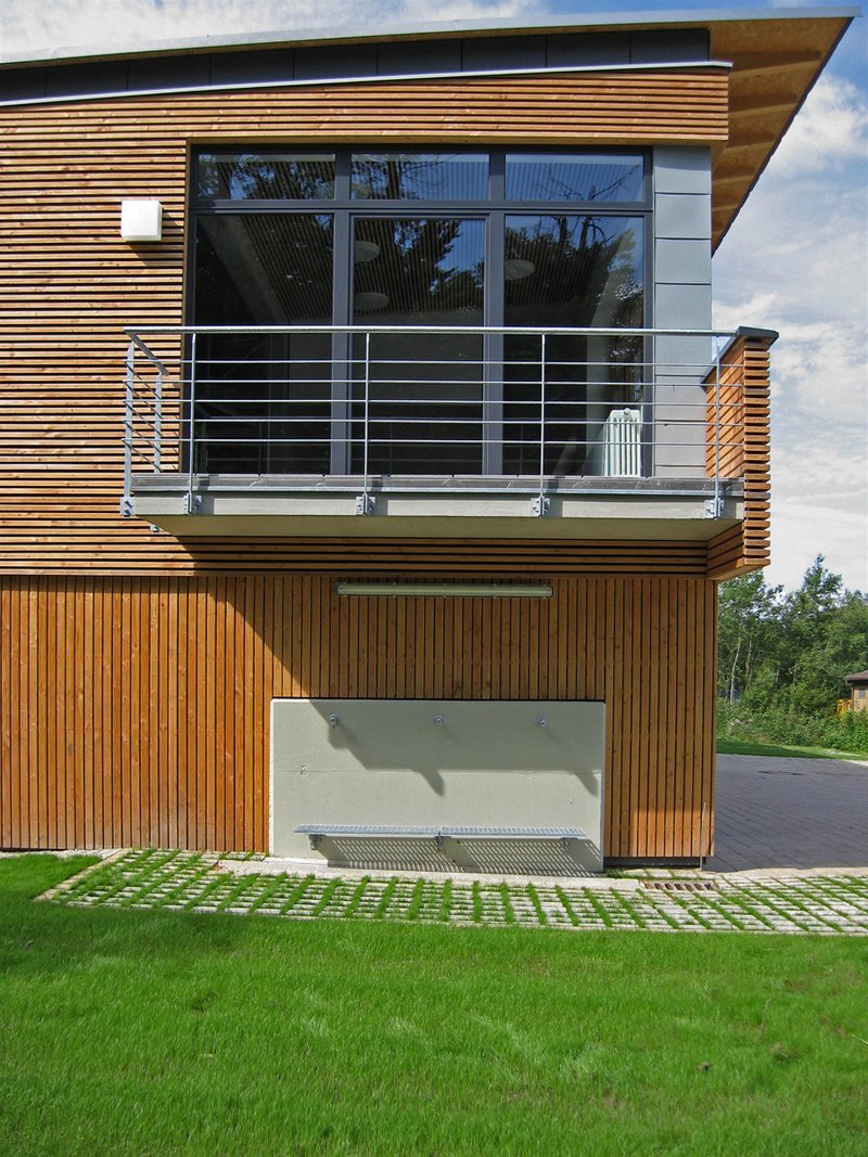 Detaillösungen betonen den praktischen Aspekt. So ist ein Balkon im ersten Stock zugleich die Überdachung für die Stiefelwaschanlage im Erdgeschoss.