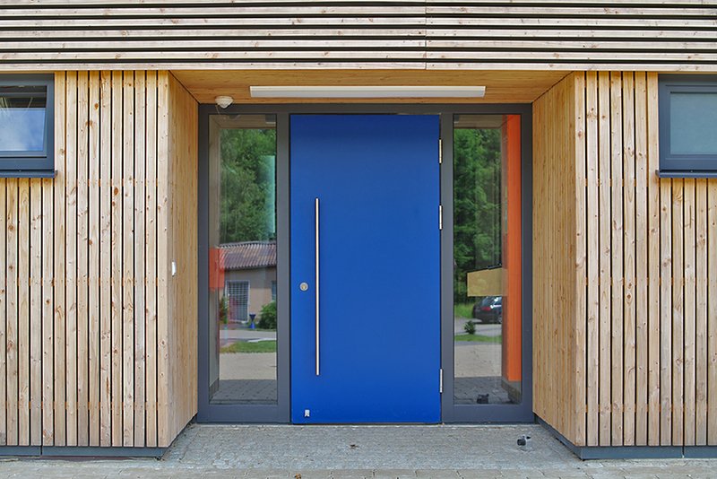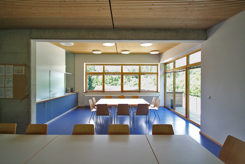 Die Gliederung der Räume spiegelt sich in der Fassade durch die Anordnung der Fensterbänder wieder. Es wurde versucht wenige unterschiedliche Materialien zu verwenden und diese möglichst roh (unbehandelt) einzusetzen, dadurch wurde ein ruhig wirkendes Gebäude geschaffen.