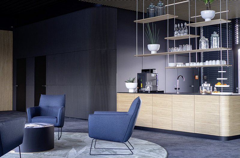Daher wurde mit neuen, ungewöhnlichen Oberflächenmaterialien gearbeitet. Eingesetzt wurden Wandoberflächen von Buxkin, unterschiedliche Akustikoberflächen, sowie nachhaltige Materialien aus Wolle und Leder. Durch die Gestaltung in der Farbgebung und der Verarbeitung ist ein warmes, wohnliches Entrée entstanden, welches die Herzlichkeit und Professionalität des Unternehmens reflektiert. Innen- und Außenraum gehen auf Grund der großflächigen, bodentiefen Fassadenverglasung ineinander über und vermitteln Großzügigkeit und Transparenz.