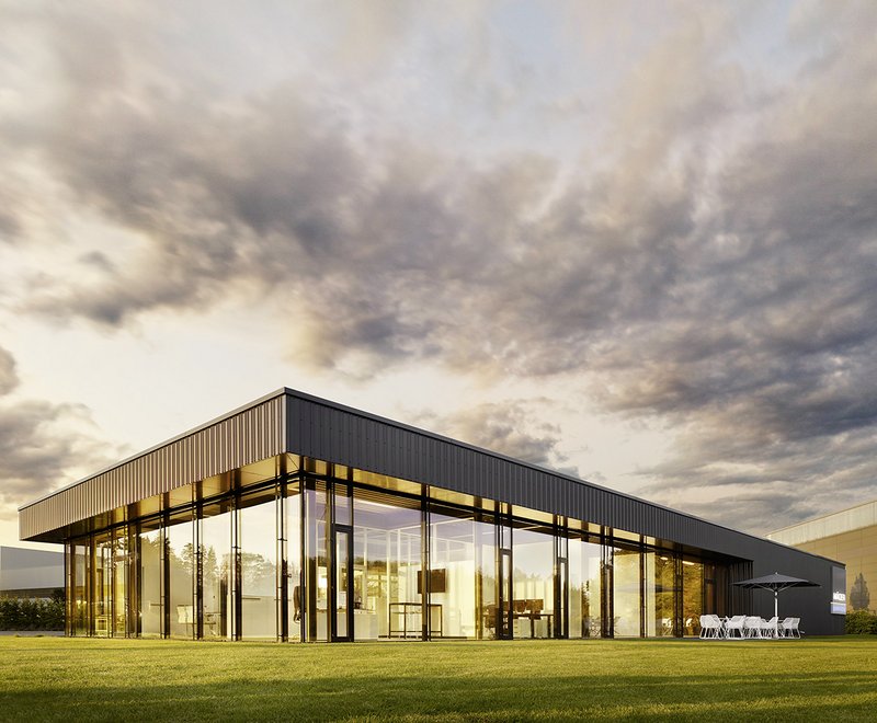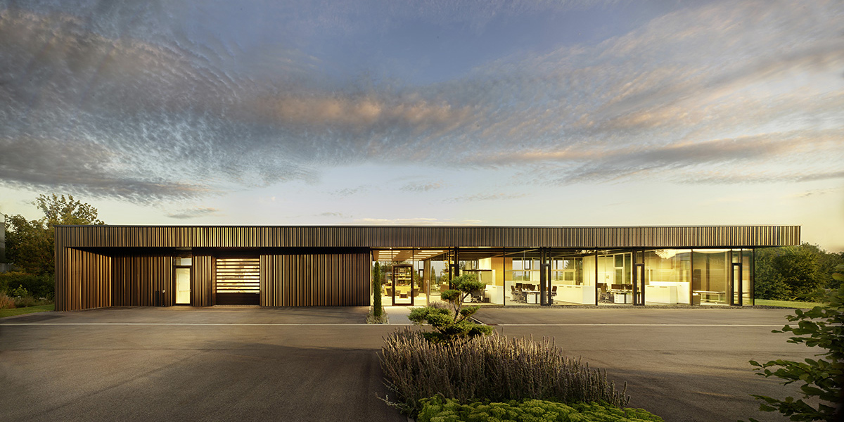 Der Lager- und Logistikbereich hingegen besitzt eine geschlossene Fassade. Diese besteht aus einem individuell gekanteten Stahlblech. Die Untersicht des Vordachs ist aus Alucobondplatten. Die Grundrisszonierung teilt das Gebäude in Abschnitte. Die Mittelzone querseitig beinhaltet die Nutzung als Empfang, Wartebereich, Teeküche, Pausenraum, sowie die Terrasse. Die Sichtachse ist geprägt von einer durchgehenden Holzlamellendecke. Die Mittelzone längsseitig stellt die Verbindung zum Lager- und Logistikbereich dar. Bei Bedarf kann die Mobilwand zum Lager paketiert werden, um eine räumliche Verbindung herzustellen. Der Sozialbereich und der Technikraum bilden zwei Kerne, die mit akustisch wirksamem Material belegt wurden.