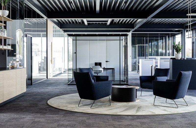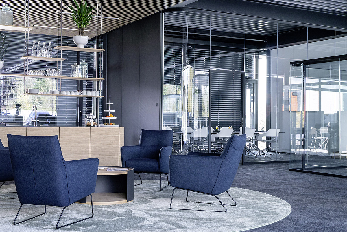 Der Bürobereich ist komplett verglast und als eine Mischung aus Open Space Bereich und kleineren Büroeinheiten für die Geschäftsleitung und Besprechungsräume ausgeführt. Die Abtrennung erfolgt durch hauseigene Trennwandsysteme, das Büro dient also gleichzeitig auch als Showroom.